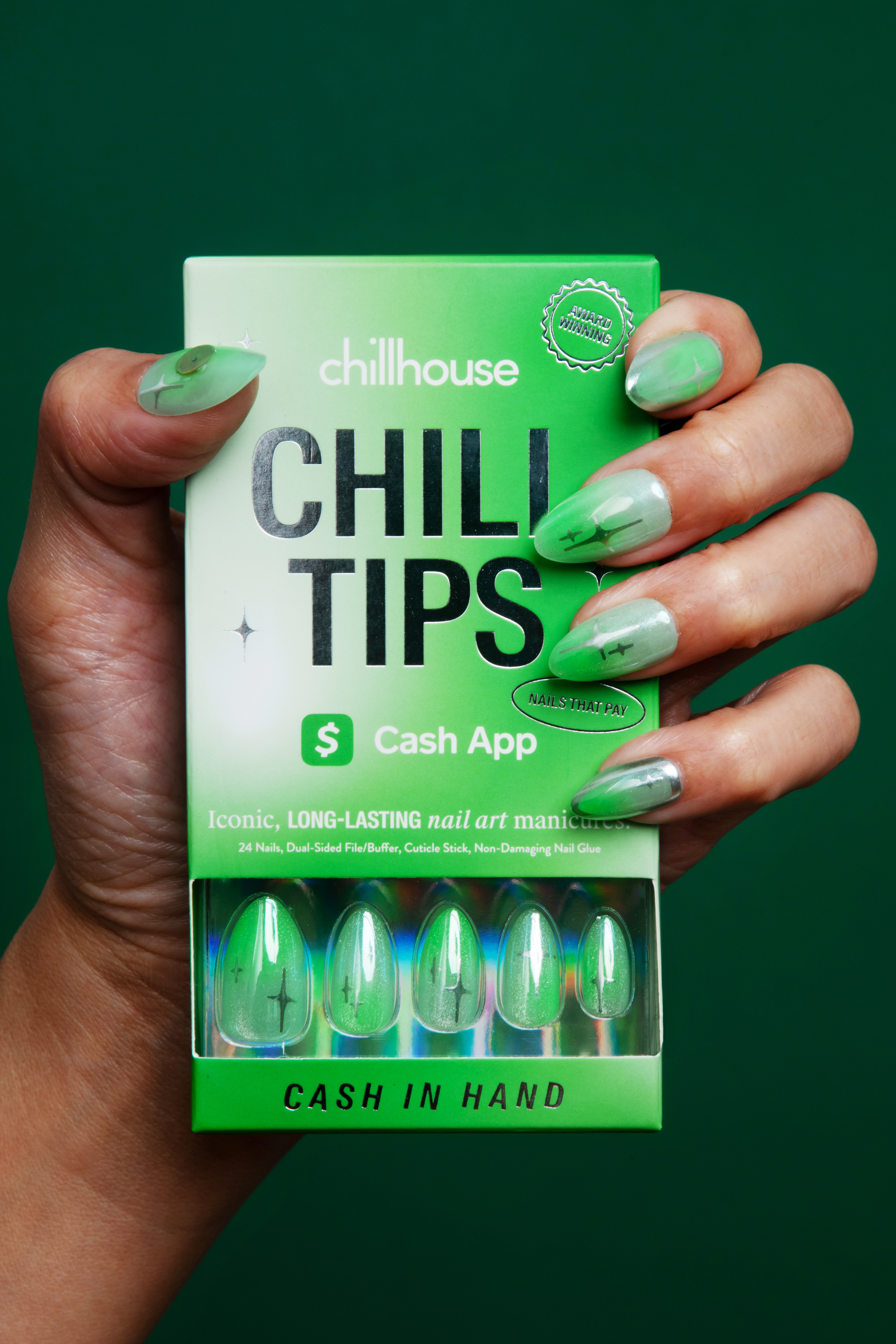 Cash App, the money app that allows consumers to spend, send and store money, today announces a partnership with Chillhouse, the New York City-based nail studio and spa to release Cash in Hand, a limited-edition set of their award-winning press-on nails. Incorporating innovative new technology via an RFID chip in each Chill Tips nail set, the collaboration allows customers to easily send money with the touch of a finger, making it the first time you actually want to ‘chip’ your nails.